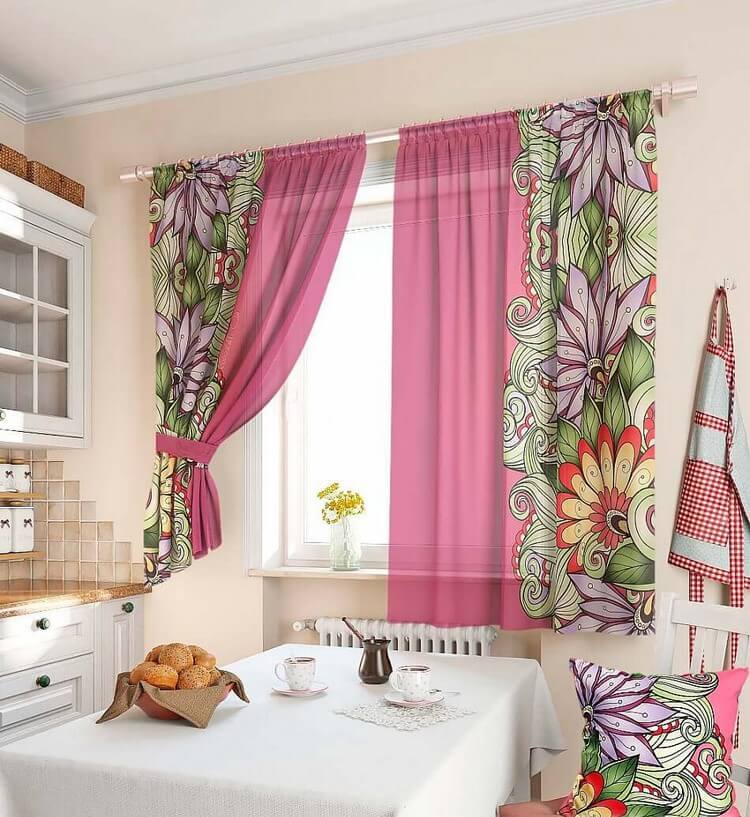 - În 2020, modelele de design cu un tipar extraordinar câștigă popularitate. Diferite modele sunt în tendință: de la celula clasică la tema florală. Proprietarii de bucătării în stil eco ar trebui să acorde atenție perdelelor cu imaginea plantelor tropicale, motive etnice.