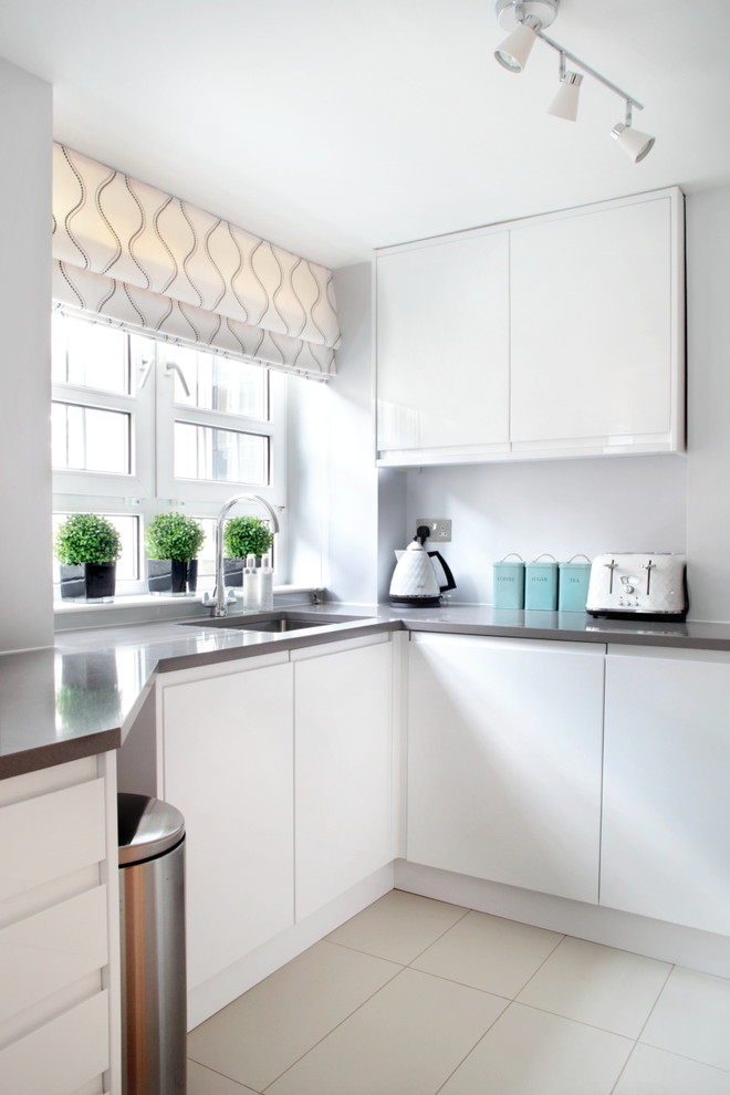 - Perdele romane. Jaluzelele romane translucide sunt în vârful popularității. Sunt ideale pentru bucătăriile mici din apartamente mici, estetice, ușor de curățat.
