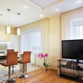 O astfel de combinație arată optim în studiouri, precum și în camere combinate care îndeplinesc mai multe funcții simultan - o bucătărie + living sau bucătărie + sufragerie.