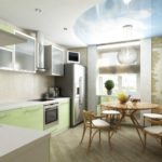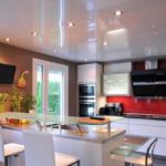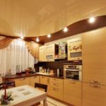 - Tavanele întinse sunt un adevărat lider printre acoperiri. Avantajele acestui material includ durabilitatea, varietatea de modele disponibile, posibilitatea de a aranja un sistem de iluminare într-un mod convenabil. Folia din PVC vă permite să decorați tavanele din bucătărie cu o fotografie sau o imagine și, de asemenea, puteți salva vecinii de sus de inundații, restrângând umiditatea. Siguranța de mediu a materialului și metoda de instalare sunt îndoieli - filmul, la fel ca toată camera, este încălzit la temperaturi ridicate.