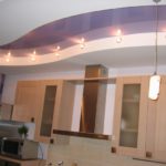 - Acoperirea tavanului cu gips-carton va ascunde toate defectele din suprafață și va asigura o izolare fonică suplimentară. Gresia este folosită pentru a crea tavane suspendate și structuri pe mai multe niveluri atunci când alegeți această opțiune de proiectare specială pentru tavanele din bucătărie. Cu acesta, puteți ascunde conductele și firele.