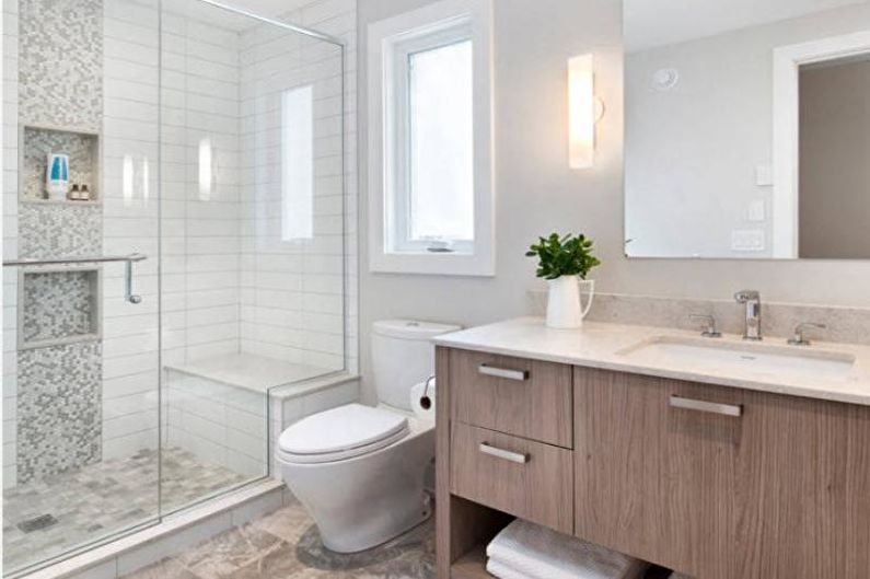 Culoarea albă este aproape un „clasic”, dar nu este de dorit să vă îmbrăcați totul cu o faianță „incoloră”; pare rece și incomodă. Cu o combinație de gresie complet albă, sticlă și armături cromate fără accente luminoase, camera este mai mult ca o cameră chirurgicală.