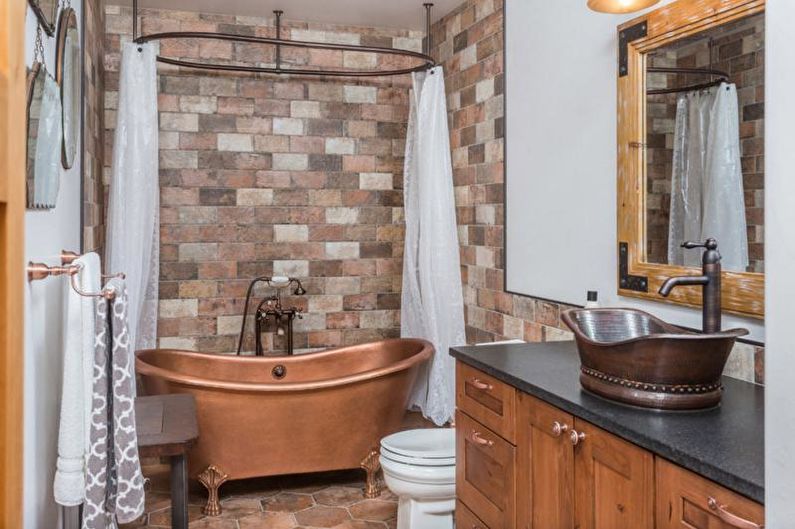 O caracteristică distinctivă a stilului este evidențiată de o inserție decorativă - o vitralie, pictată manual, model de mozaic sau un panou de dale rupte. Pe lângă estetică, merită luat în considerare latura practică. Piesele cromate, oglinzi și sticlă adesea trebuie curățate de petele de calciu.