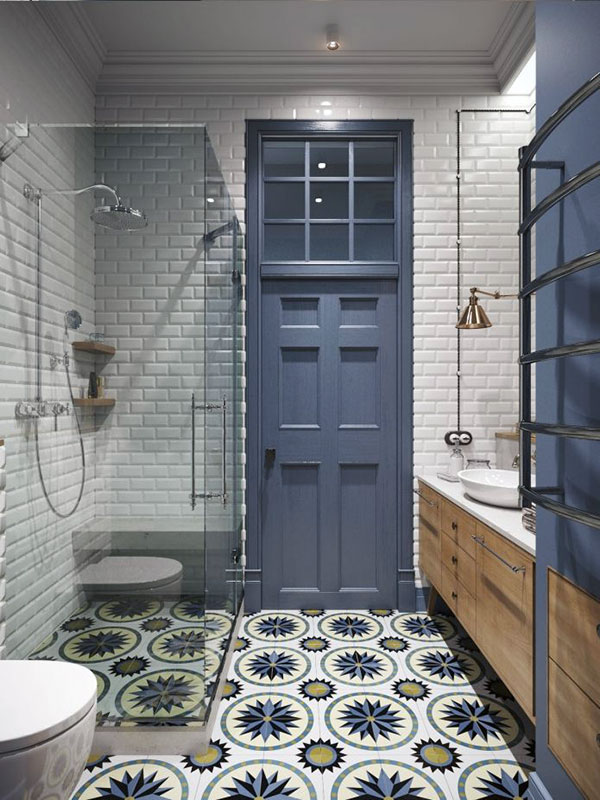 Pardoselile sunt mai bine amenajate cu gresie din porțelan marmorat sau cu inserții din piatră naturală.Este important ca suprafața să fie drenată - podelele să nu alunece sub picioarele ude după baie.