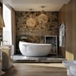 - Une pierre. Les murs peuvent être décorés avec de la pierre naturelle ou artificielle. Ces matériaux sont chers. Cependant, ils ont des performances incroyables. La pierre est très durable, durera plus de quinze ans, a une résistance élevée même aux dommages mécaniques importants.Vous n'avez même pas à parler du design extérieur extraordinaire de la finition - il vaut mieux voir personnellement une belle salle de bain avec un tel design dans les photos présentées dans cet article.