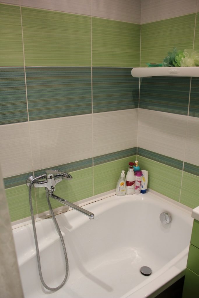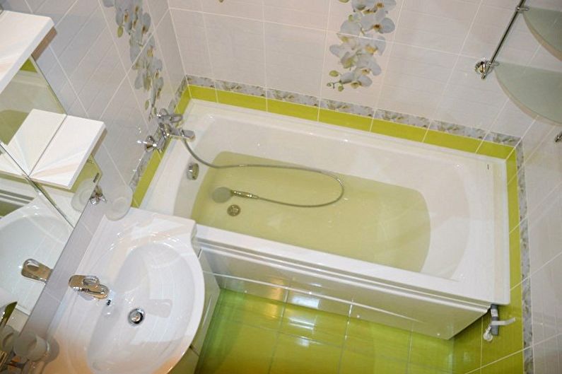 - Le revêtement de couleur claire est le choix parfait pour une petite salle de bain. S'il s'agit d'un revêtement combiné, de deux couleurs contrastées, vous devez terminer horizontalement. Par exemple, rendez le haut clair et le bas foncé.