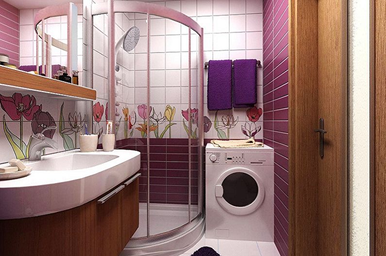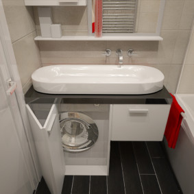 Une salle de bain d'une petite surface de 2 mètres sur 2 mètres vous permet de placer un lavabo au dessus du lave-linge. La forme d'un nénuphar sera magnifique, ce qui implique un système de drainage spécial, conçu pour la machine. Cette conception est totalement sûre.