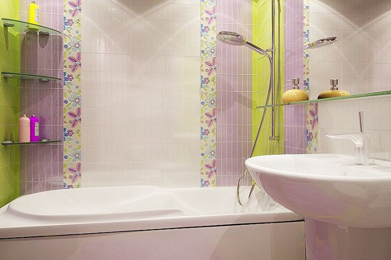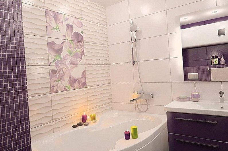 Il existe de nombreuses options pour décorer une pièce: peindre les murs avec des peintures à l'eau, appliquer une image ou faire un motif en relief à l'aide de mastic. La méthode la plus populaire consiste à disposer les carreaux. Ce matériau est un leader depuis de nombreuses années, il est idéalement adapté aux caractéristiques opérationnelles pour les conditions de la salle de bain. La décoration des murs avec des mosaïques est très élégante. Une bonne option économique est les panneaux en PVC avec lesquels vous pouvez imiter le bois ou la pierre. Compte tenu des petits paramètres de la pièce, il est préférable de privilégier les teintes claires avec de petits dessins.