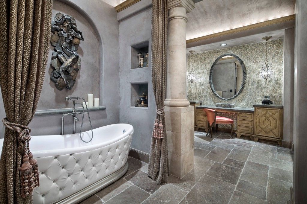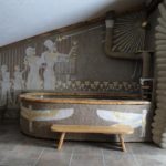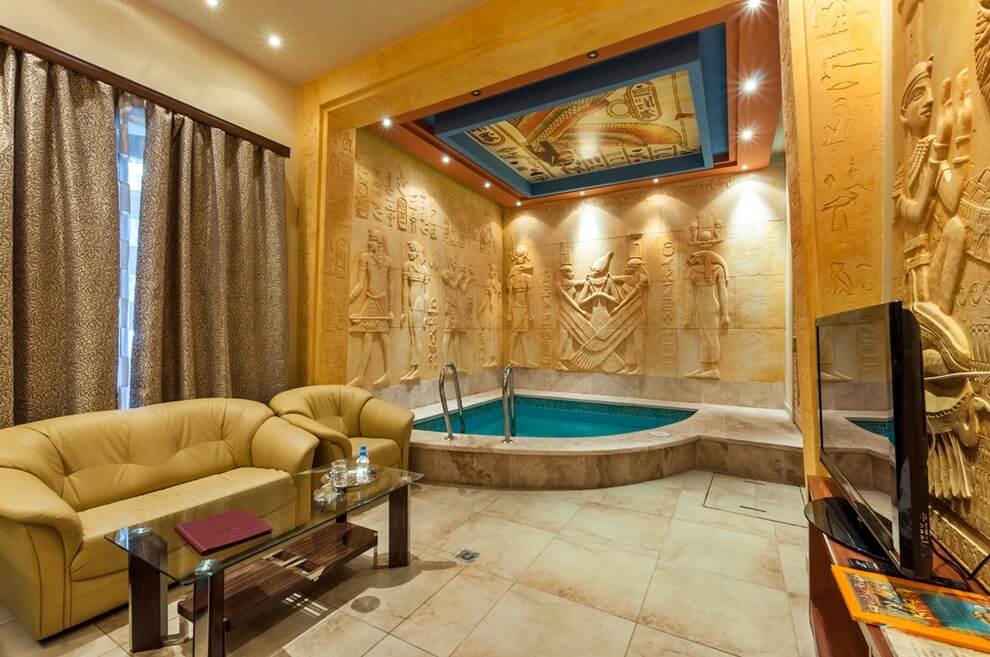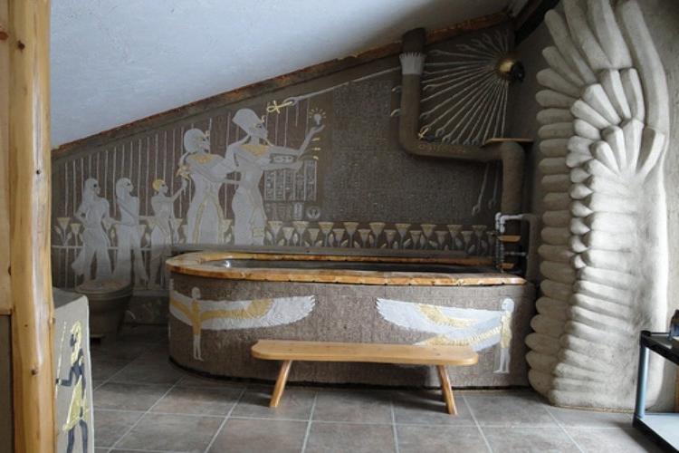 La salle de bain de style égyptien est un message direct aux pyramides de Gizeh et aux structures monumentales. Lors de la conception de l'intérieur, des matériaux simples et rugueux rappelant l'antiquité sont utilisés. La décoration des murs et des sols est en pierre, ce qui rend le design indépendant du temps.