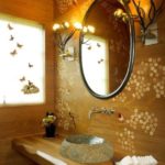 Les textiles dans une telle salle de bain peuvent être marqués non seulement avec des serviettes, mais aussi avec divers capes et tapis. Le marché propose une large gamme de produits similaires. Comme accessoire de base, vous pouvez installer un auvent en bois dans la salle de bain. Il aura l'air très inhabituel et original.