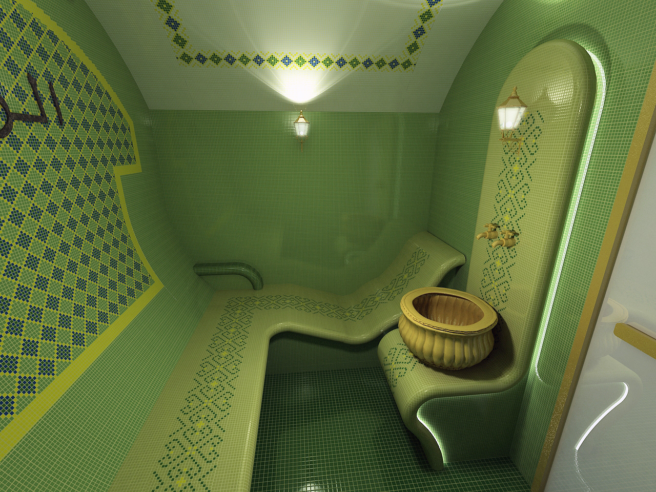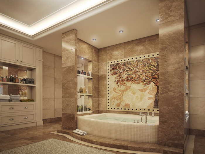 Un élément tout aussi important est le kurna - un récipient spécial en marbre, conçu pour effectuer des ablutions. L'accent est mis sur elle à l'aide d'un piédestal ou d'une arche en mosaïque avec rétro-éclairage.