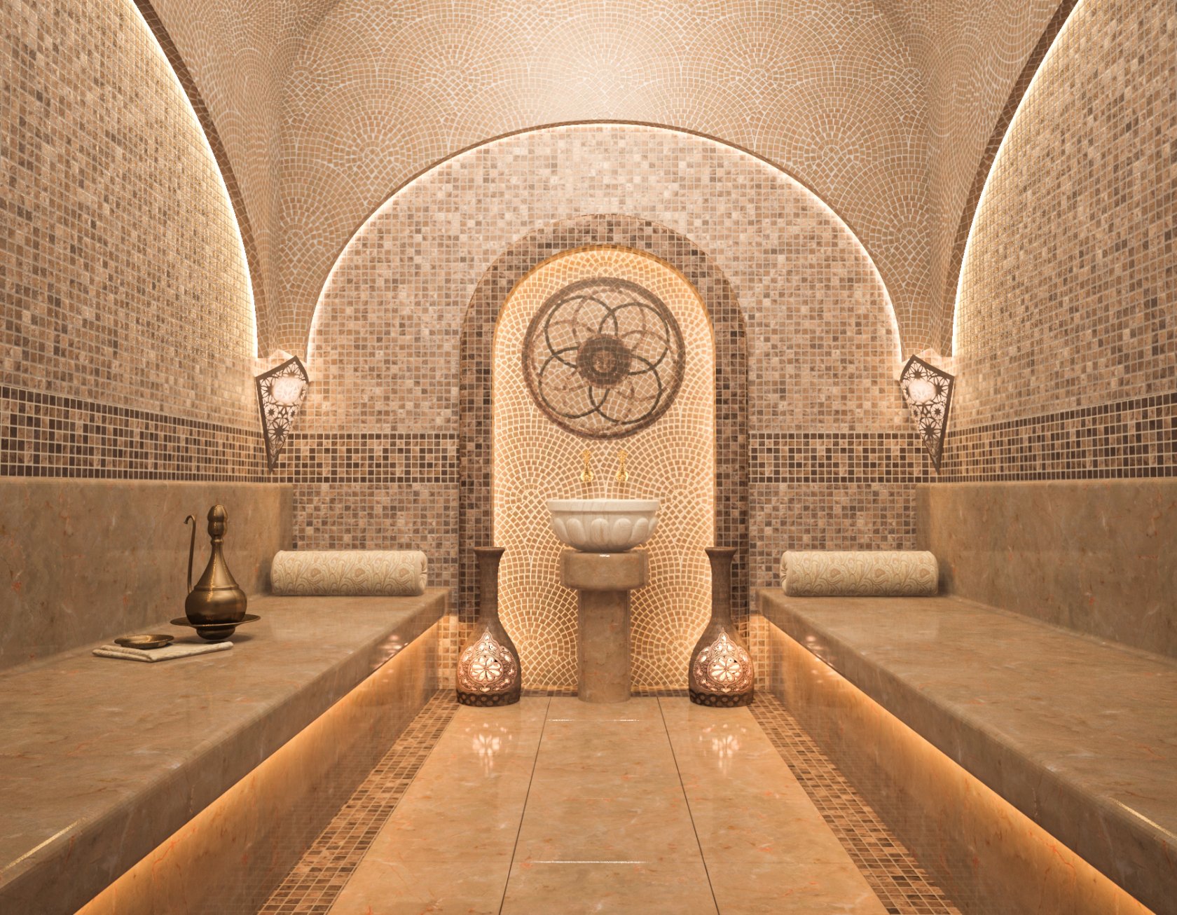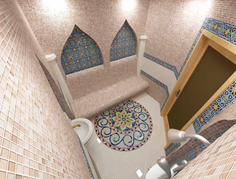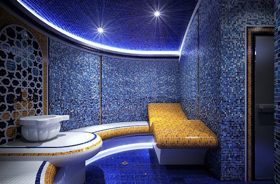 Comme éléments décoratifs supplémentaires, divers types d'éclairage et inserts décoratifs inhabituels sont activement utilisés. Le dôme rond au-dessus du hammam est une partie importante de la décoration générale, lui donnant une ambiance particulière.