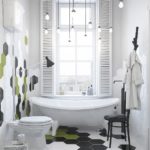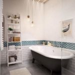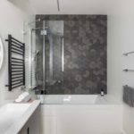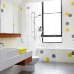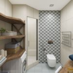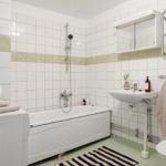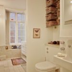 De plus, les accessoires textiles ont une fonction décorative - un tapis au sol, un rideau sur la salle de bain et des serviettes. Ils peuvent être avec des motifs géométriques, des couleurs vives, contrastant avec la garniture d'arrière-plan.