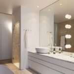 Beaucoup de lumière crée une atmosphère confortable et chaleureuse, elle se reflète dans les miroirs, le brillant des carreaux légers et dispersés dans l'espace. Dans une petite pièce, il est pratique d'installer des spots. Dans une grande pièce, vous pouvez installer un lustre, un lampadaire ou une applique de la conception originale, ils rempliront à la fois des fonctions pratiques et esthétiques.