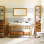 Les meubles en bois auront l'air harmonieux, ils vont bien avec les murs blancs et la plomberie. Les meubles en bois brut, en particulier les résineux, sont particulièrement impressionnants - la texture y est mieux visible.