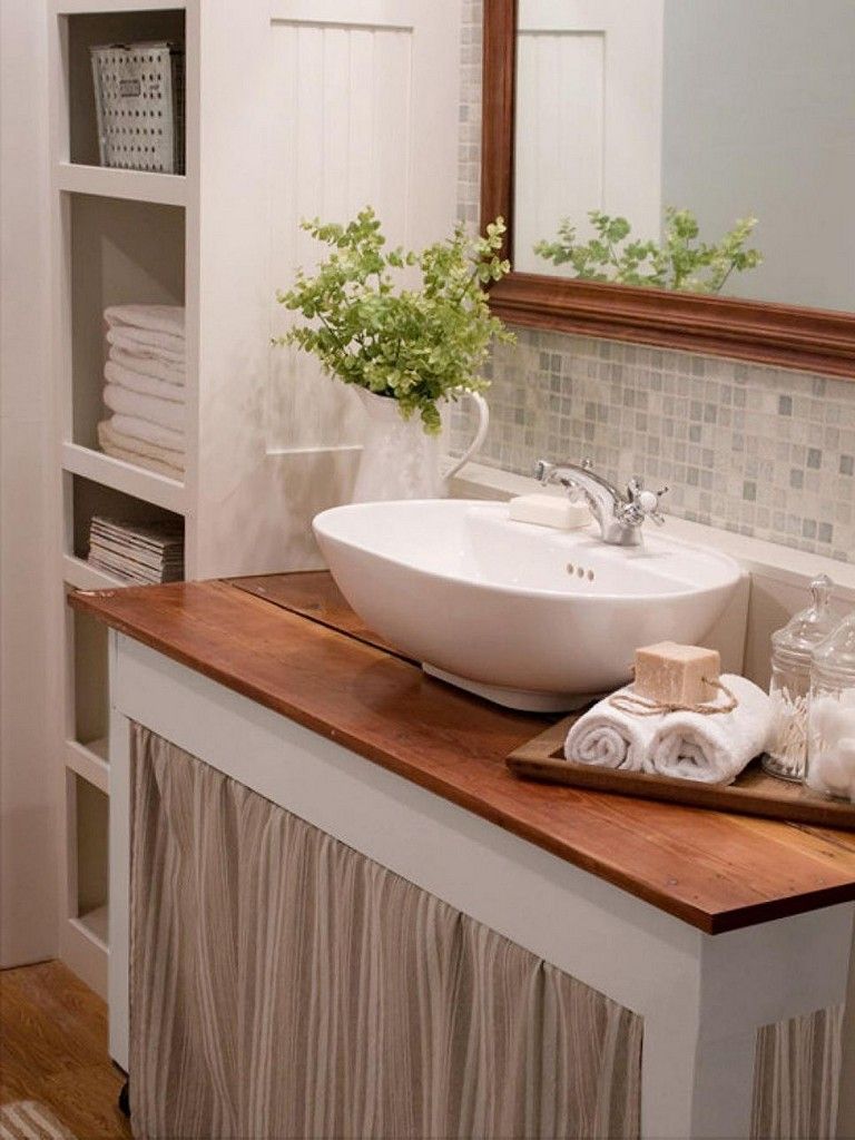 Vous pouvez également toujours trouver une place pour diverses étagères ouvertes. Si un boîtier d'installation est installé dans la pièce, il (ou plutôt sa surface horizontale) peut être utilisé pour masquer toutes les communications dans la cavité: tuyaux et alimentation en eau.