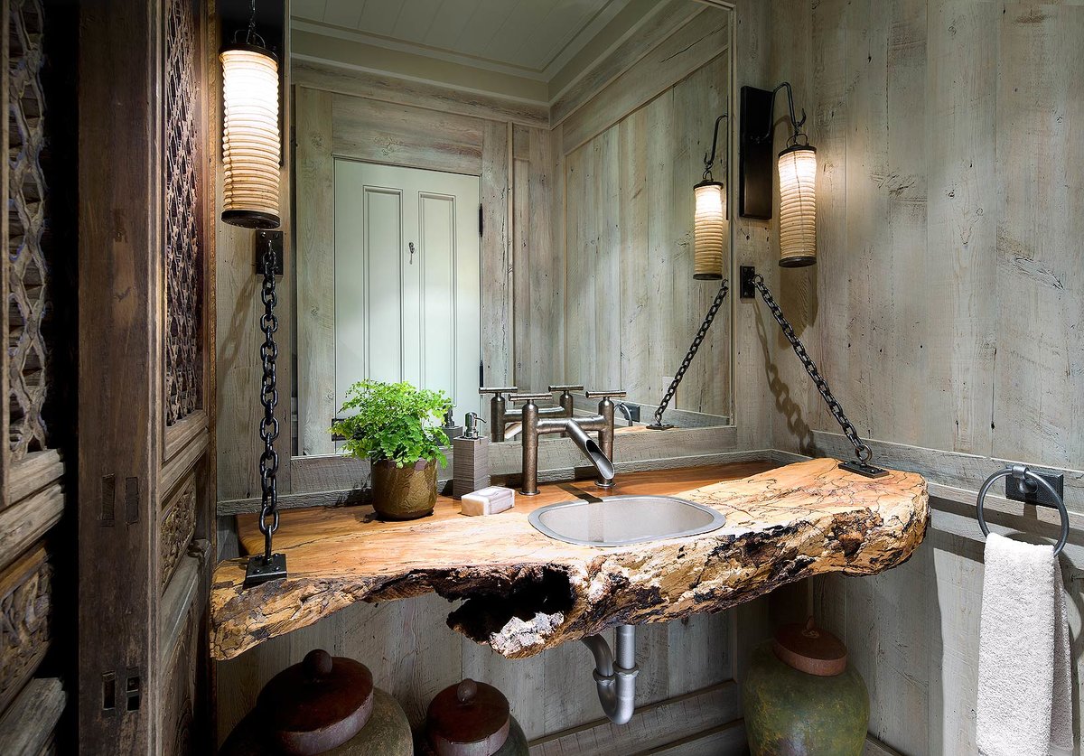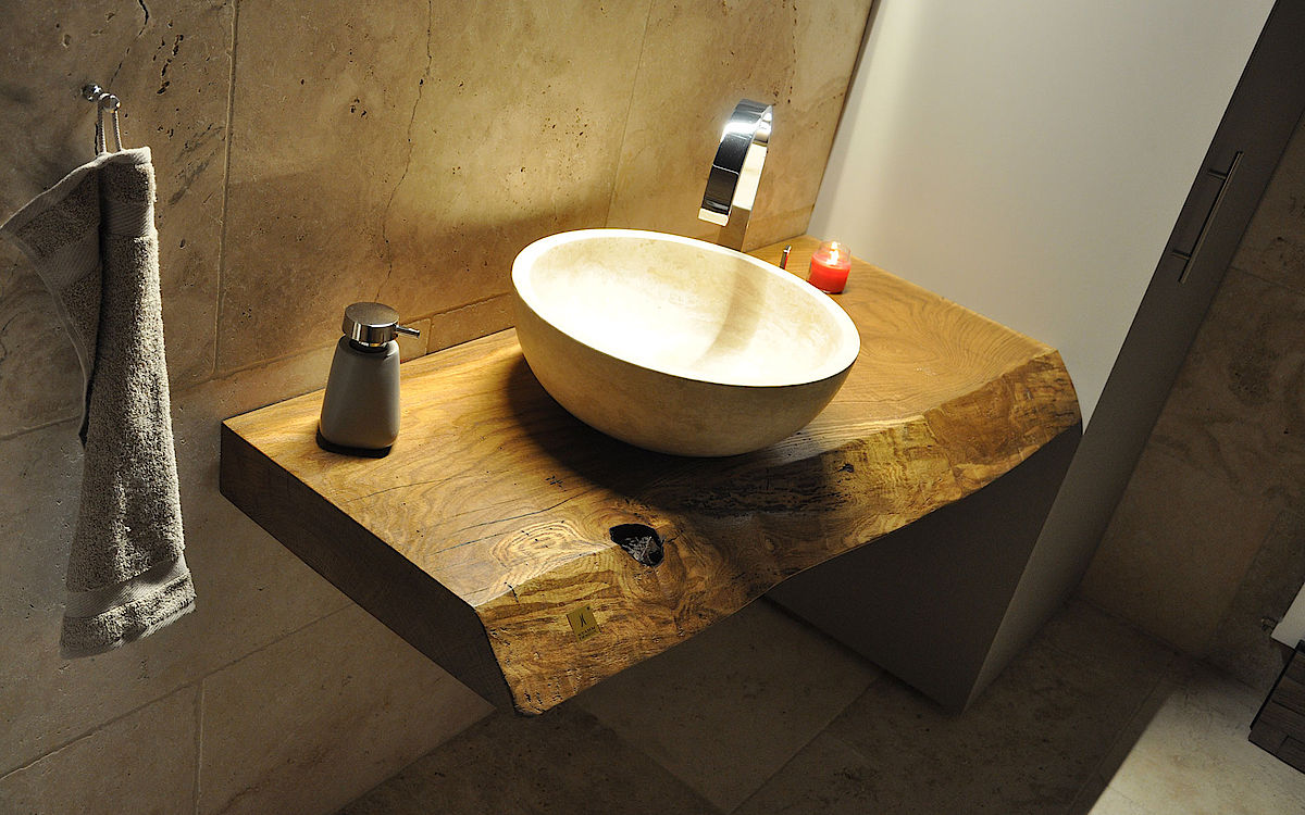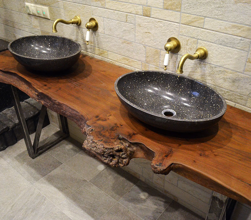 Mais une bonne recommandation pour les fans de cette exclusivité. Trouvez l'évier sous le lavabo en pierre naturelle. En dessous, obtenez une table en bois d'apparence ordinaire en bois grossièrement transformé. Cet arrangement vous surprendra tous les jours, sans parler des nouveaux invités.