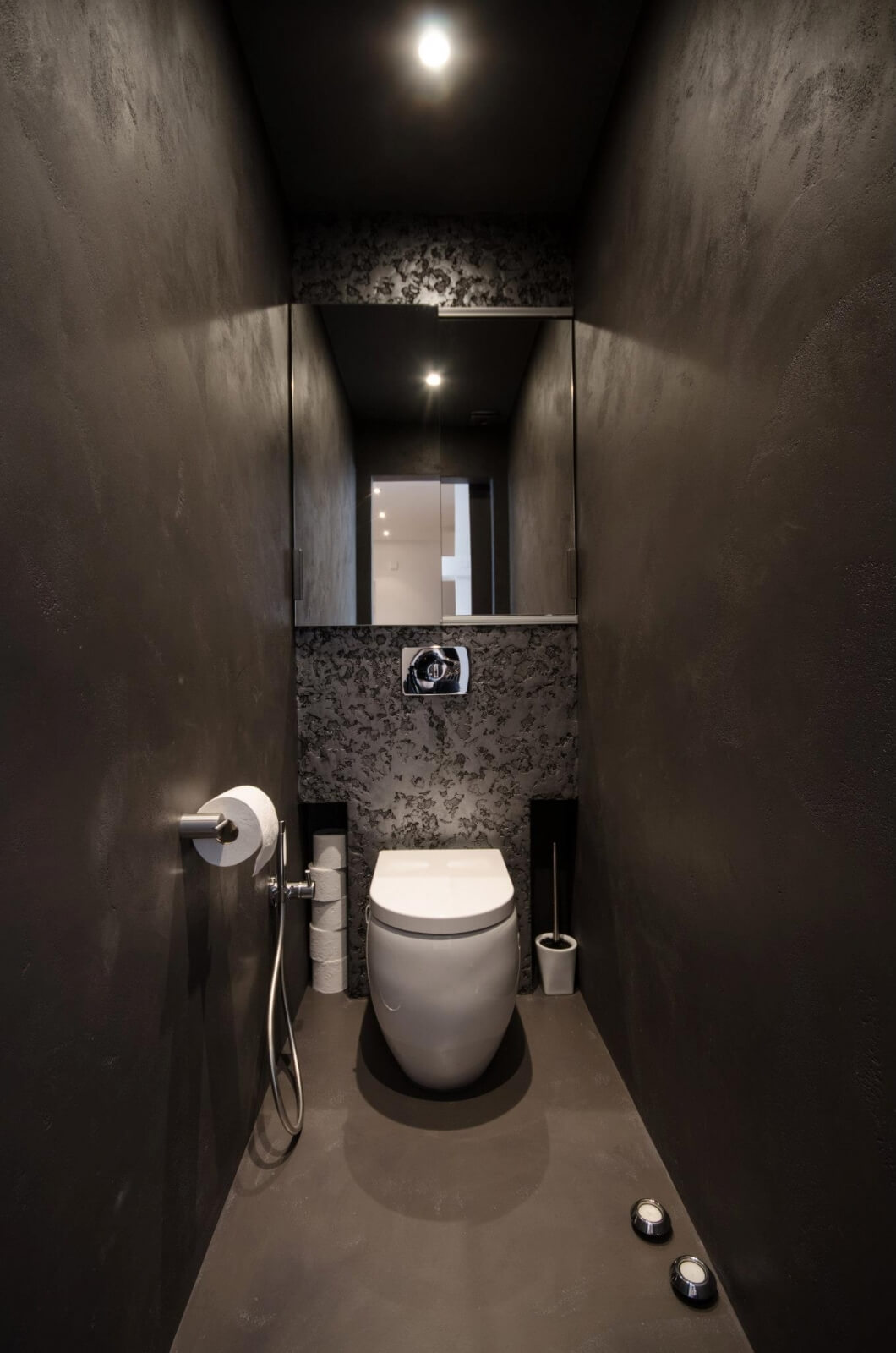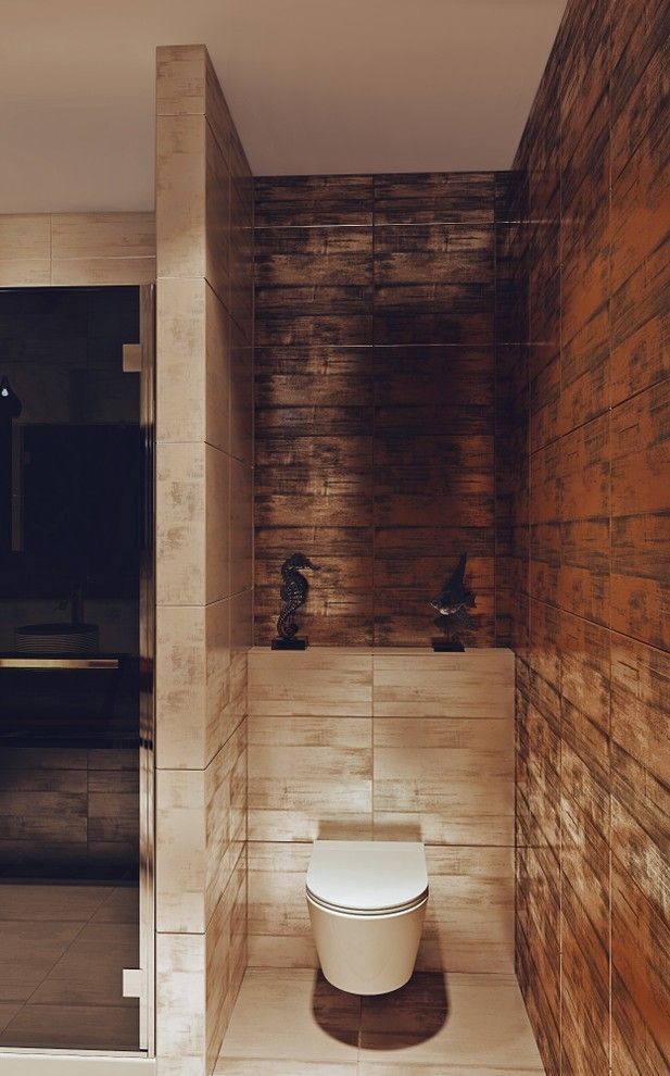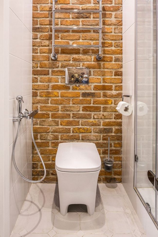 Cette conception des toilettes Loft, qui peut être vue sur la photo ci-dessous, est organisée à travers une sélection rigoureuse d'équipements de plomberie, d'appareils électroménagers et de meubles. Chaque petite chose compte ici. Tout est judicieusement assorti.