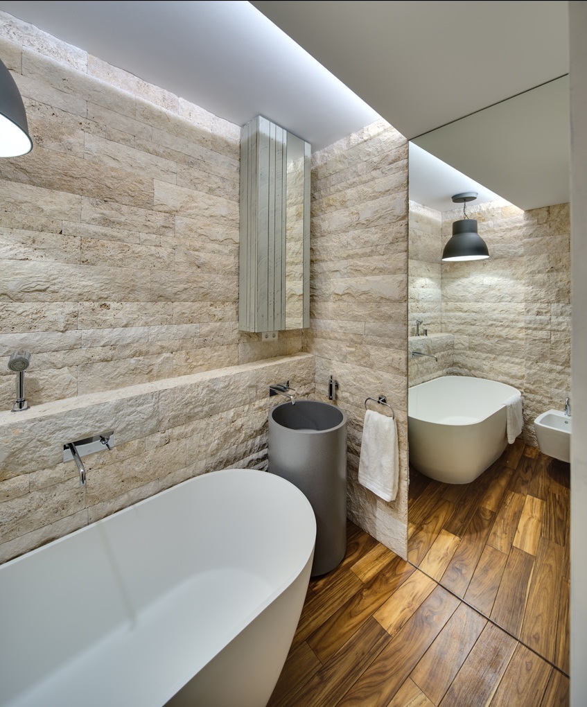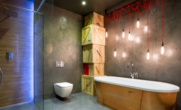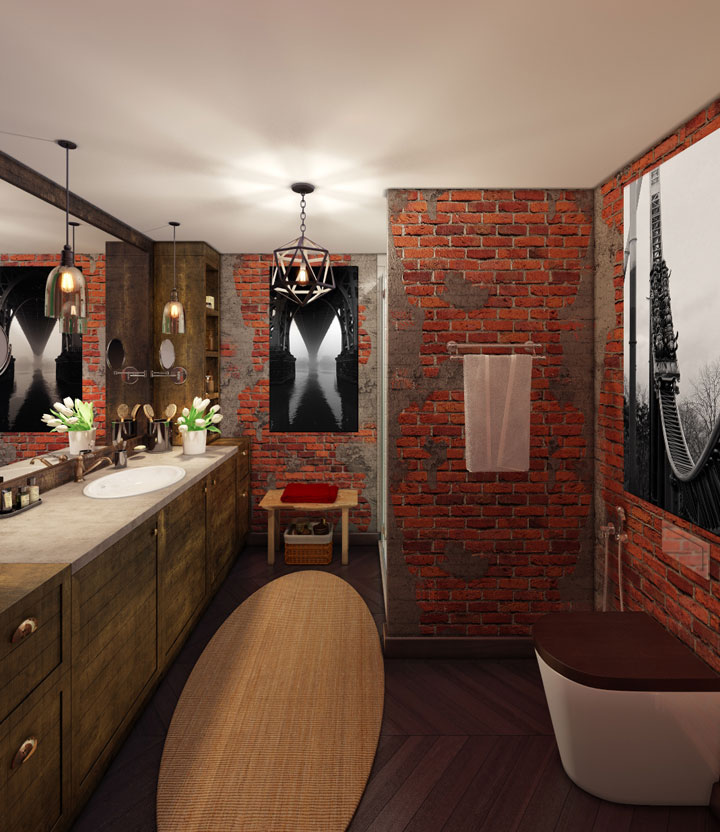 Il n'y a pas de règles strictes concernant la direction des couleurs dans un loft. La salle de bain peut être décorée dans des couleurs claires et sombres.