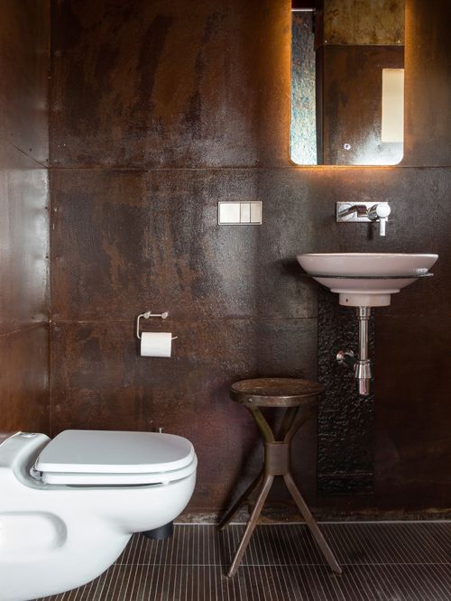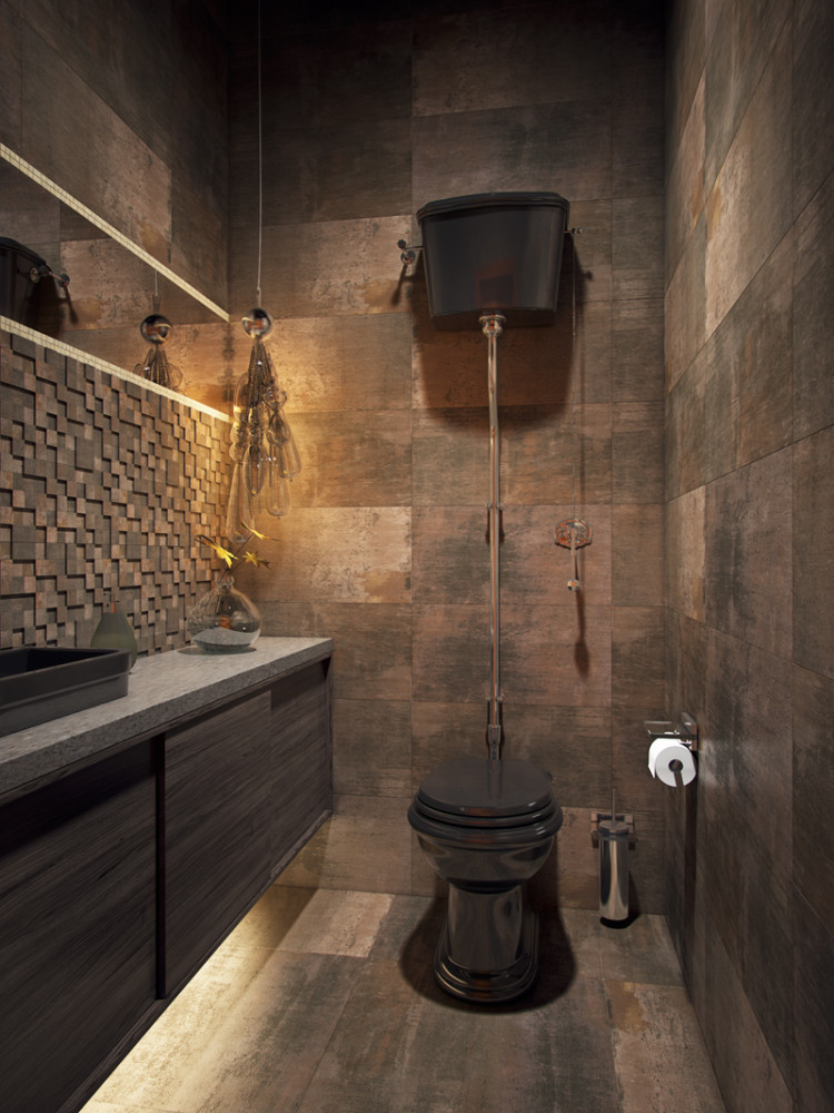 La conception des toilettes dans le style Loft nécessite des matériaux de finition spéciaux. Si votre maison a une maçonnerie parfaite, de belles cloisons en bois au plafond ou quelque chose qui ne nécessite pas de traitement supplémentaire avec des matériaux de finition, alors vous avez de la chance. Vous pouvez mettre en évidence ces caractéristiques, transformant avec succès la forme générale de l'espace.