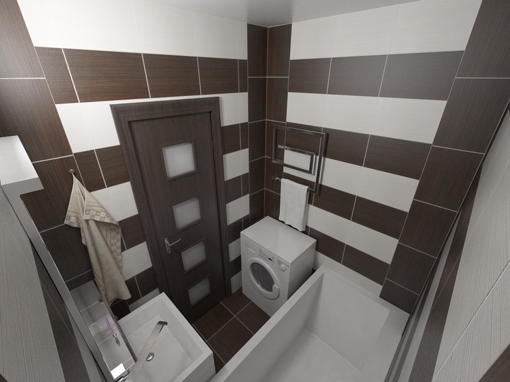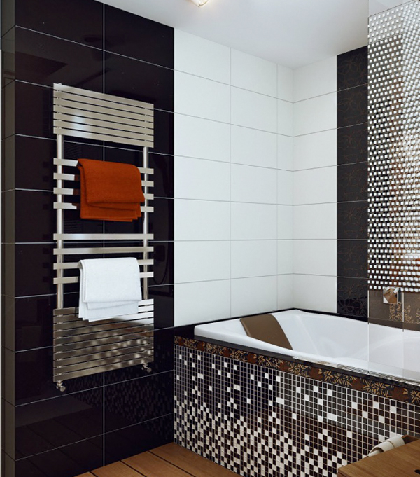 - Pose horizontale ou diagonale de carreaux carrés ou rectangulaires - élargit le mur (ce qui est important pour une salle de bain étroite), il doit ensuite être décoré avec des panneaux, des éléments de plomberie et autres;