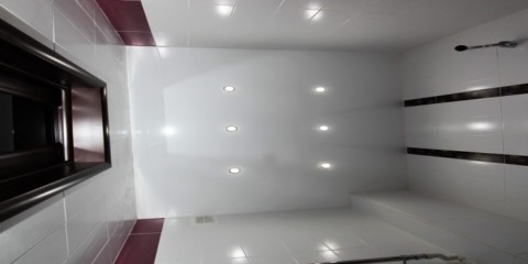 Pour décorer le plafond de la salle de bain, utilisez souvent des panneaux de rack de 10 à 12,5 cm de large, autrement appelés doublure en plastique