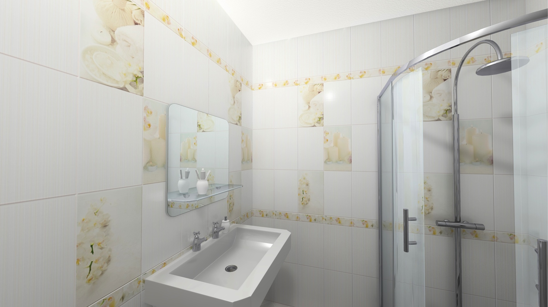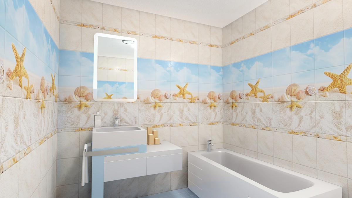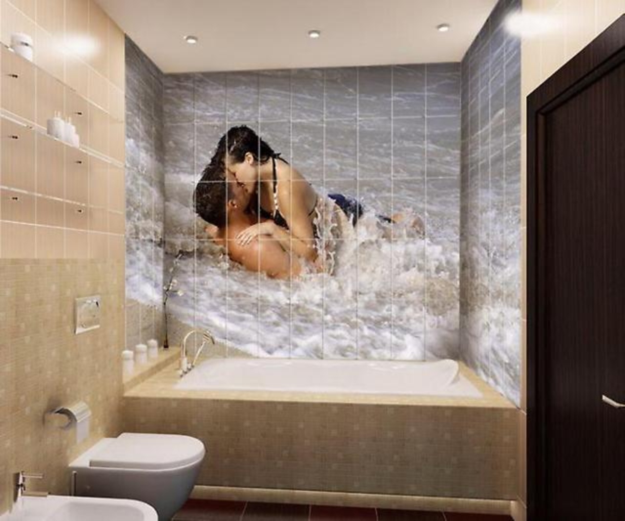 La chambre est élégante et moderne, décorée de panneaux avec différents motifs, qui sont combinés dans une certaine séquence. Par exemple, un panneau avec des dessins est fait autour d'un miroir ou d'une douche. Et le reste se fait en une seule couleur.