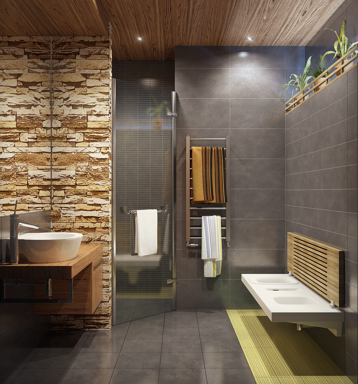 Si vous avez la priorité de choisir un matériau de plafond respectueux de l'environnement - pensez au bois. Les avantages sont nombreux: belles nuances, naturel, isolation acoustique, aspect esthétique. C'est idéal pour une salle de bain de style loft. Il existe également des inconvénients: le danger d'incendie, les effets actifs de moisissures ou de champignons, pour les soins dont vous avez besoin pour acheter des solutions et des produits spéciaux coûteux.