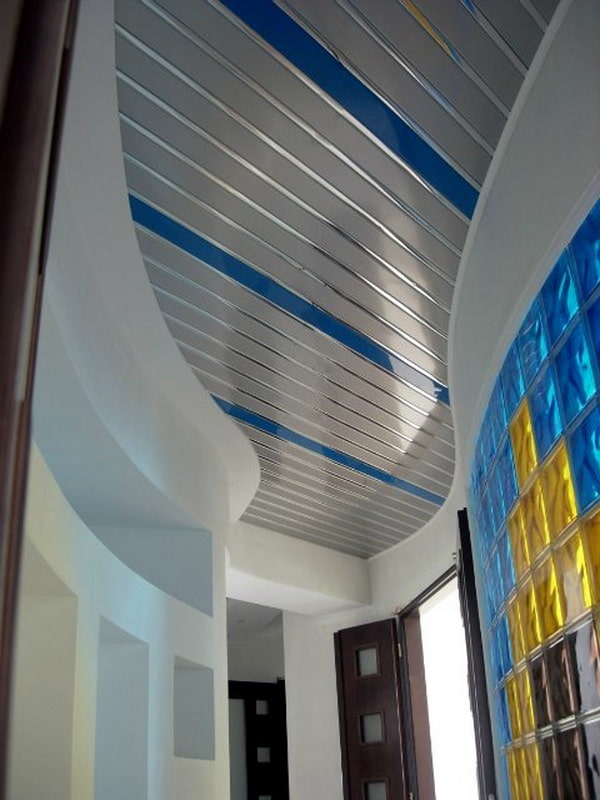 Le design doit être pensé à l'avance. Que ce soit un plafond à plusieurs niveaux ou simple, de quelle couleur seront les bandes, dans quelle direction.Vous pouvez créer un design inhabituel à partir des racks, par exemple, sous la forme de rails. Il existe de nombreux matériaux pour l'incarnation des idées.