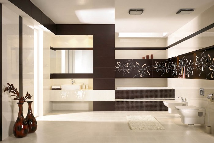 Faites attention! Pour maximiser l'espace, vous devez faire des murs clairs et un sol sombre. Pour qu'ils contrastent nettement les uns avec les autres. Ensuite, la salle de bain "se corrode visuellement sur le côté". Un exemple d'une telle solution est une salle de bain classique brun-beige, où un matériau imitant le bois foncé est utilisé comme revêtement de sol. Et pour les murs, choisissez une teinte beige blanchie, presque en apesanteur.