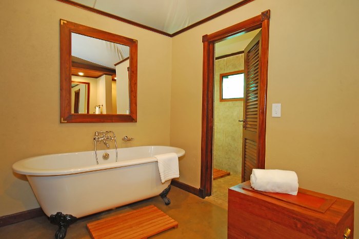 La texture du bois légèrement rugueuse semble très intéressante à côté des surfaces de faïence blanches lisses, de la peinture blanche et du stuc. Dans une baignoire beige, il vous sera utile. Selon les caractéristiques techniques, la doublure est également une bonne solution. Il est facile à nettoyer, solide et durable.