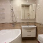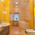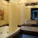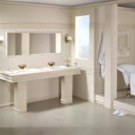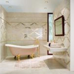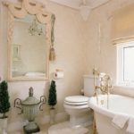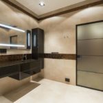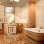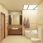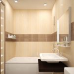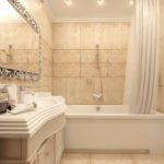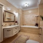 Il s'agit de murs. La conception de la baignoire dans les tons beiges implique principalement l'utilisation de cette couleur spécifiquement pour les surfaces latérales. Les meubles, le sol, le plafond peuvent également être résolus dans la même palette de couleurs. Mais ce n'est plus nécessaire.