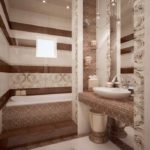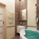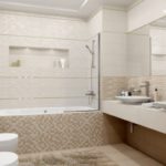 Si vous entrez dans la ligne de recherche "carrelage beige dans la conception de la photo de la salle de bain", parmi les résultats, vous trouverez beaucoup d'images où le carrelage est utilisé en combinaison avec la coloration. Cela prend généralement environ les deux tiers de la hauteur du mur. D'en haut, il reste un fragment recouvert d'une composition colorante.