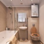 A ce stade, aucune difficulté n'est attendue. L'équipement de plomberie blanc est le plus courant. Et dans un environnement beige, il a fière allure. Un peu de murs plus sombres autour se concentrent sur la propreté et la fraîcheur de la salle de bain, lavabo, cuvette des toilettes.