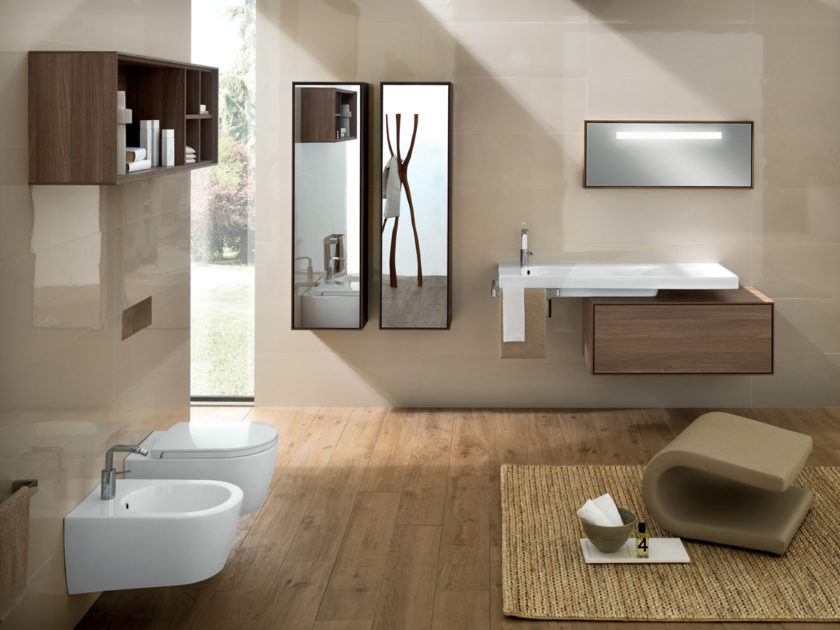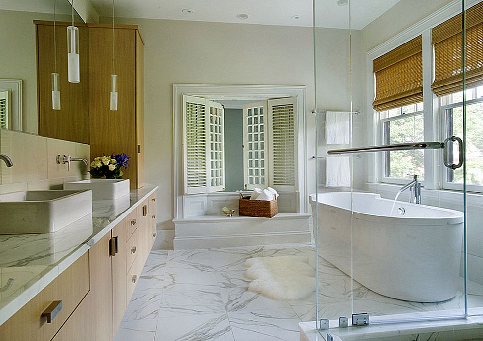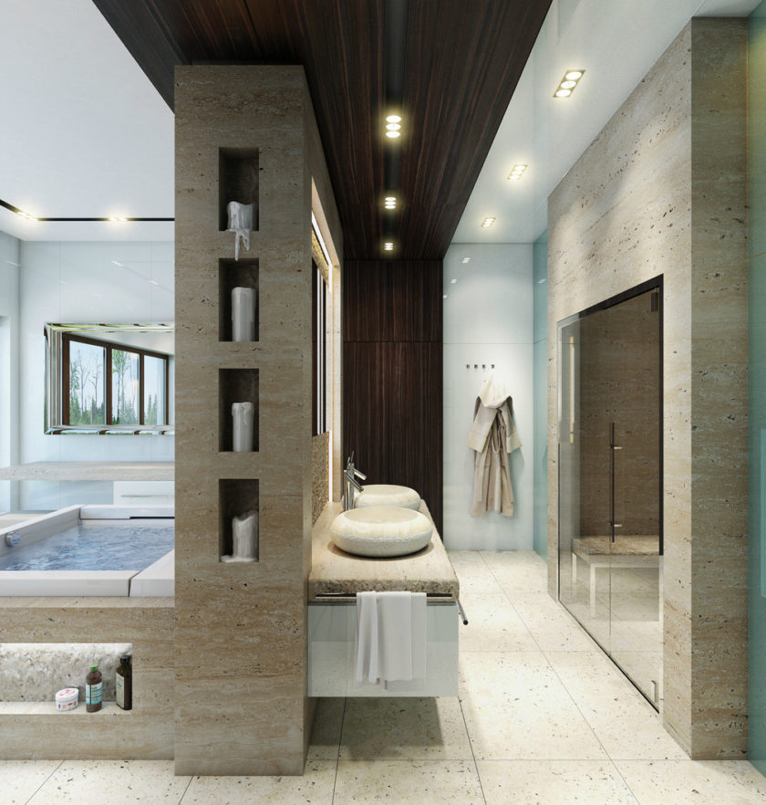Dans les appartements modernes, les salles de bain sont séparées, tandis que leur superficie est beaucoup plus grande, les appartements sont souvent équipés d'une deuxième salle de bain. Par conséquent, la salle de bain se transforme en salle de relaxation et de soins personnels. La pièce peut être zonée, combinant plusieurs matériaux dans le sol de la salle de bain. L'espace dans la «zone humide» peut être carrelé, et les zones les plus reculées avec des meubles - bois naturel. Le zonage augmente visuellement l'espace et le rend plus pratique.