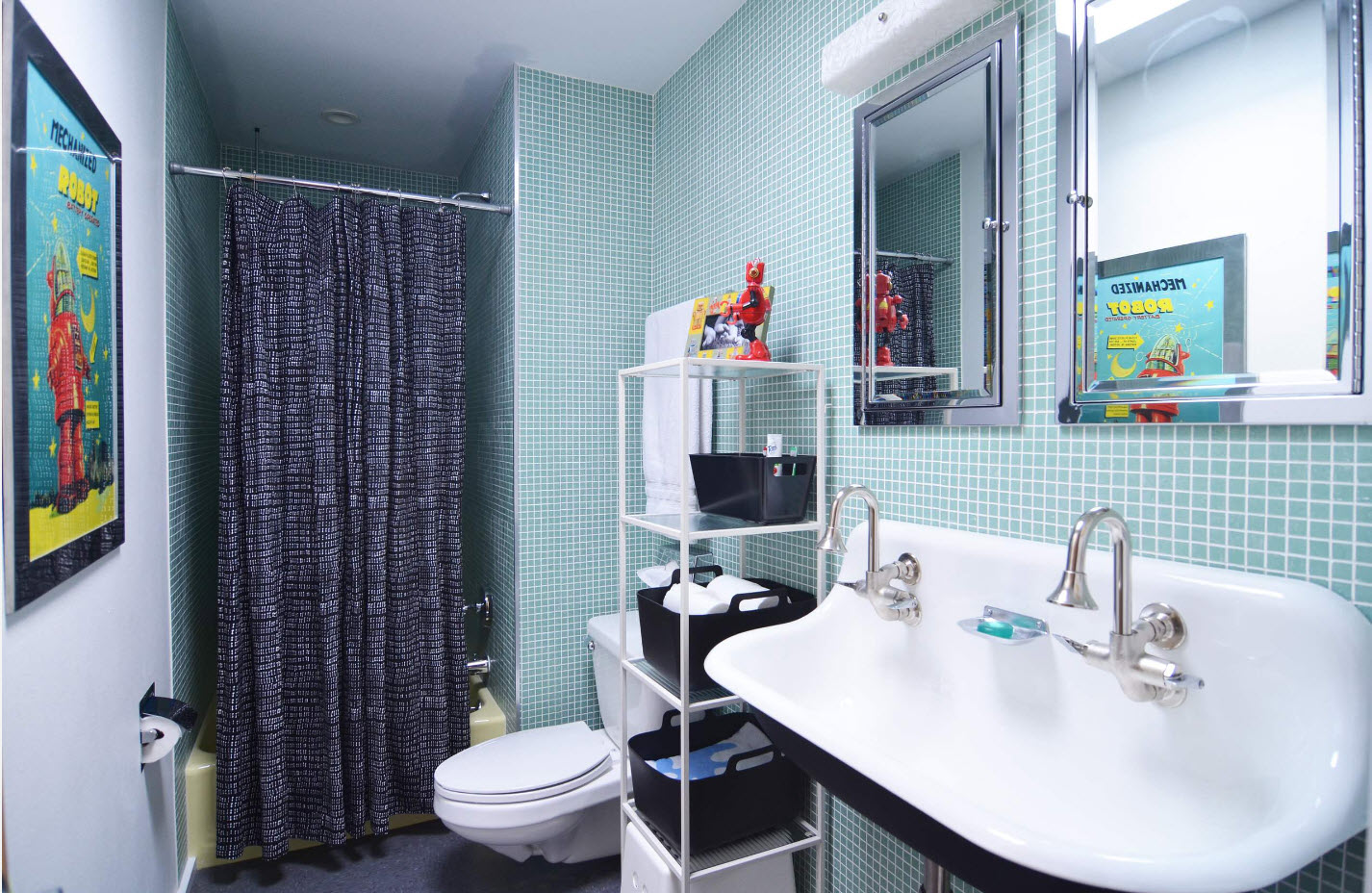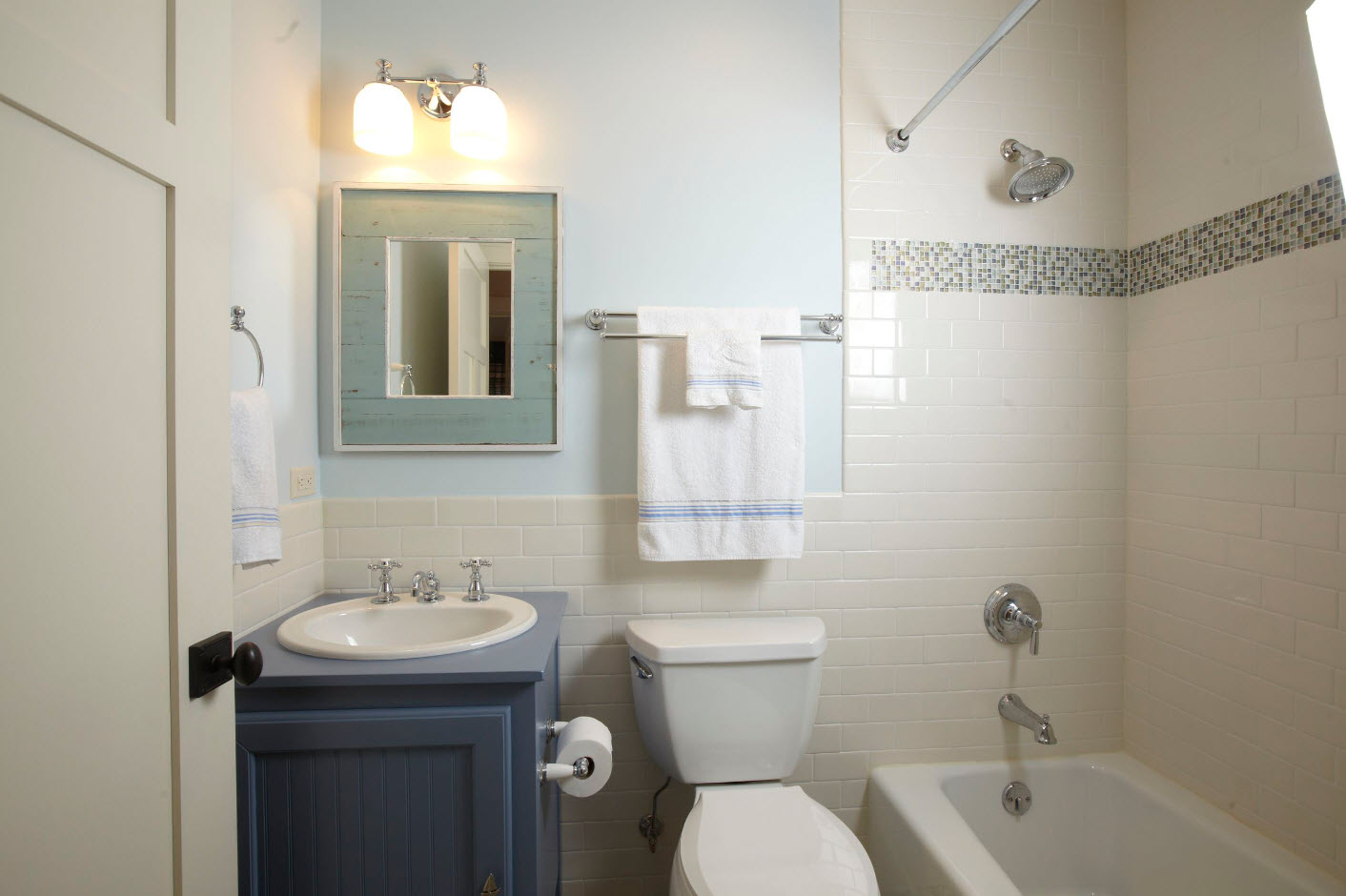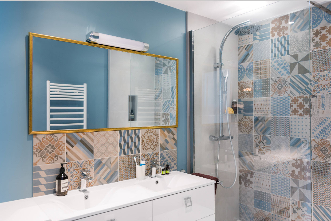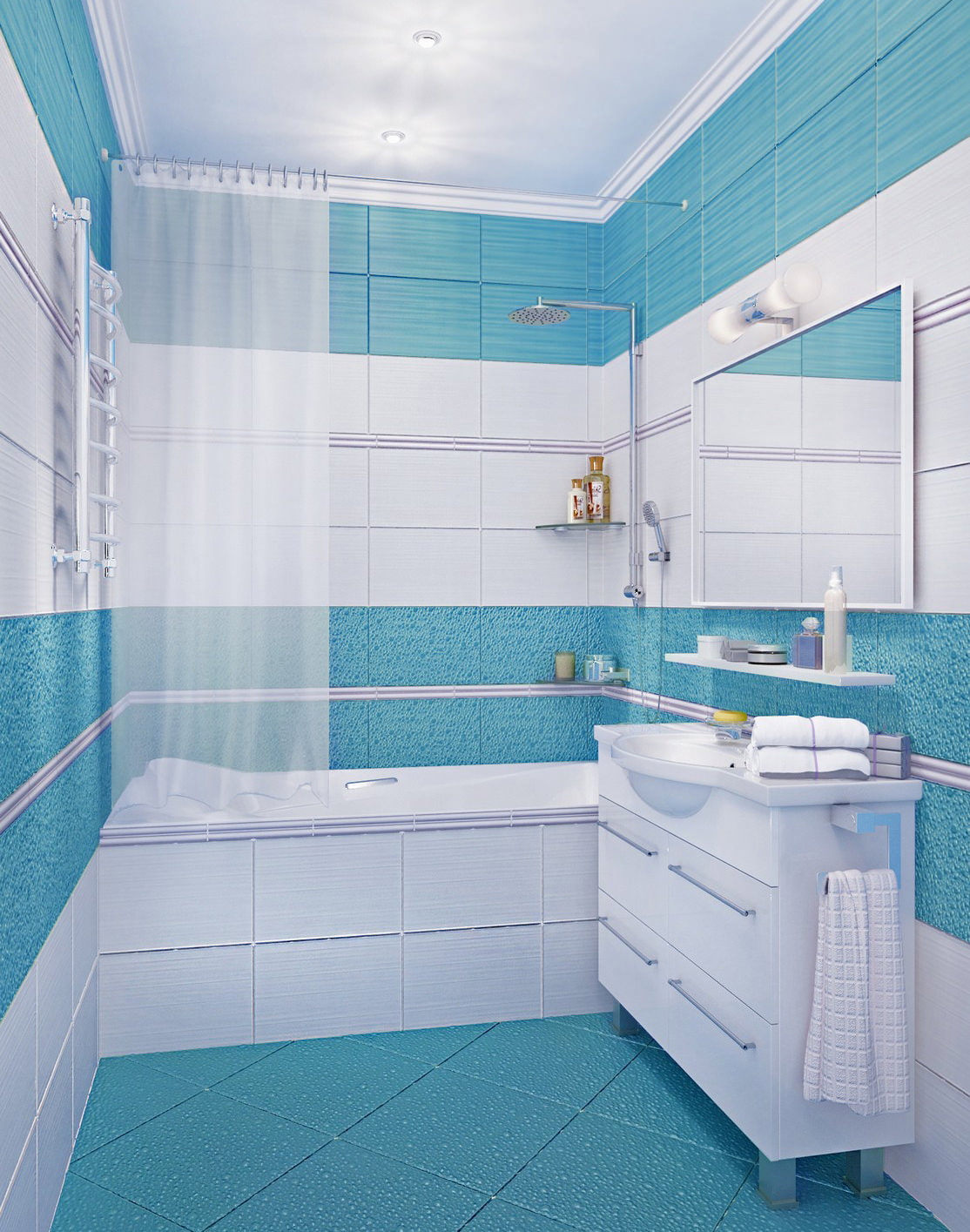 Les carreaux bleus ou turquoises déplacent visuellement les murs et la pièce apparaîtra plus spacieuse