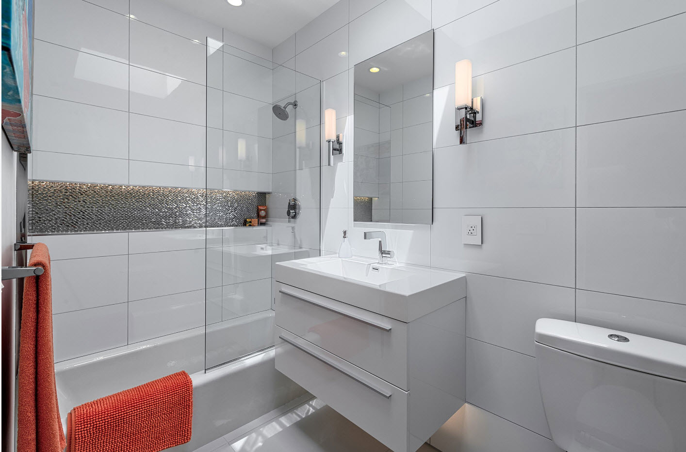 Belle salle de bain avec luminaires blancs et carreaux rouge vif
