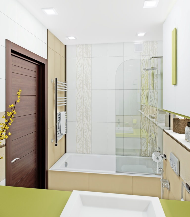 Dans la plupart des cas, les portes de salle de bain sont en verre trempé, en bois, en plastique ou en aggloméré. L'essentiel est qu'ils se distinguent par une excellente résistance à l'humidité, une résistance aux changements de température. Pour économiser de l'espace, vous pouvez opter pour des variantes de balançoire coulissante, pliante et à bras oscillant.