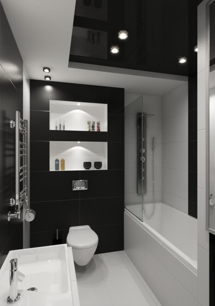 Bien sûr, les lustres massifs ne fonctionneront pas, mais aujourd'hui, dans les magasins spécialisés, vous pouvez trouver des appareils laconiques qui mettent l'accent sur le style et l'harmonie du design. Il est recommandé de ne pas s'attarder sur un seul type d'éclairage, car cela réduirait la pièce. Les variations ponctuelles sont considérées comme les plus idéales. De telles ampoules vous permettent de maximiser l'éclairage de la salle de bain, tout en ne prenant pas beaucoup de place. Ils peuvent être placés sur plusieurs rangées pour créer un look parfait et une composition unique.