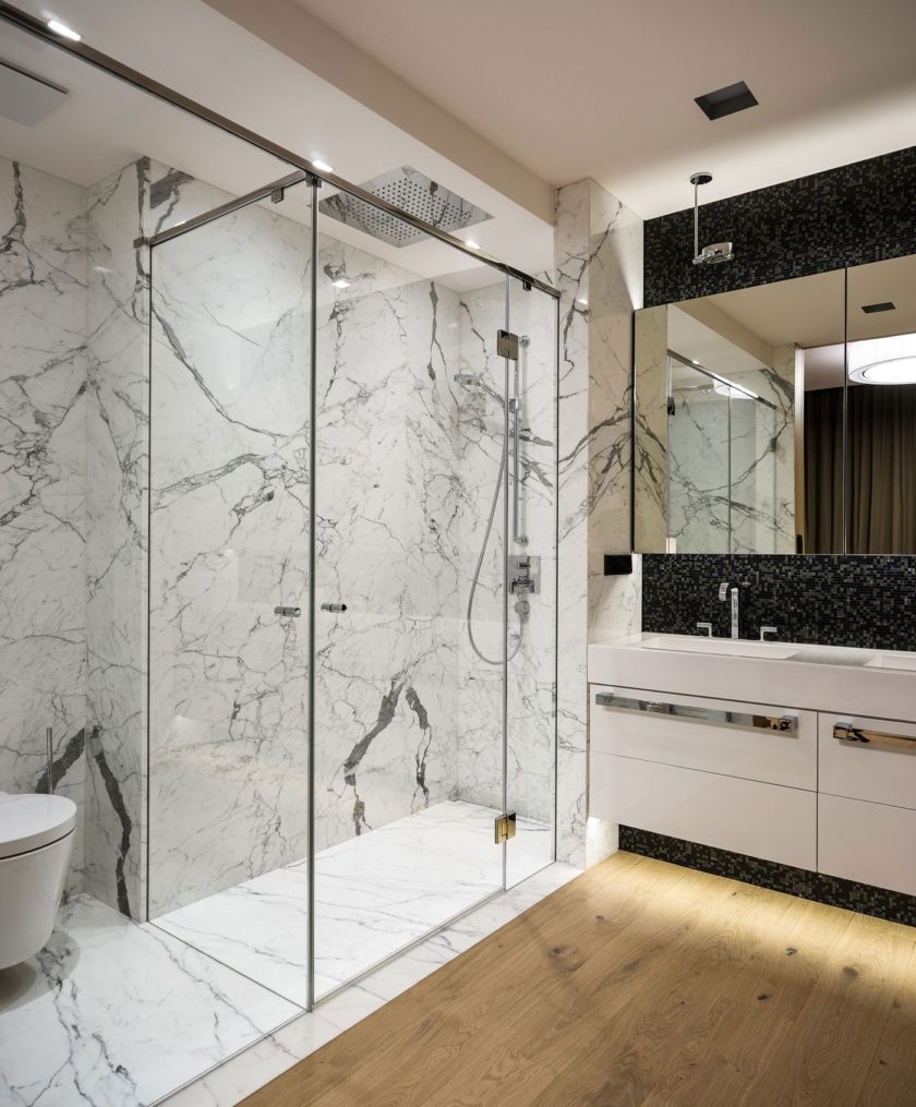 Supposons qu'une telle conception soit une solution de conception mise en œuvre en utilisant les derniers matériaux et équipements de plomberie, qui utilise des techniques qui offrent un confort et une expansion visuelle de la salle de bain.