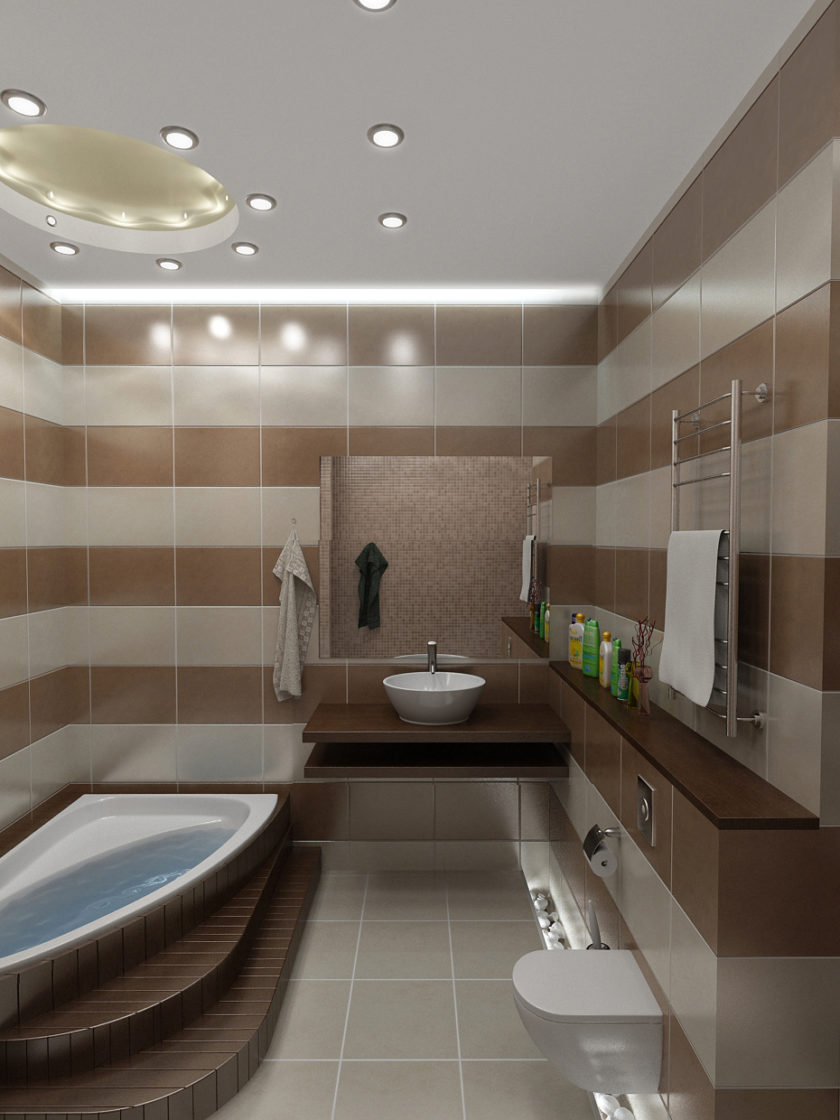 - Création directe de design, utilisant des techniques pour améliorer la perception de l'espace. Meilleur résultat en en ligne-constructeur pour voir le résultat futur avant les modifications. L'équipement de la salle de bain n'est pas bon marché, il vaut mieux corriger les erreurs avant d'acheter des matériaux de construction et des sanitaires. Les caractéristiques de conception permettent d'agrandir visuellement une petite pièce à l'aide de fleurs, de placer des appareils d'éclairage, d'utiliser des éléments décoratifs de la bonne taille.