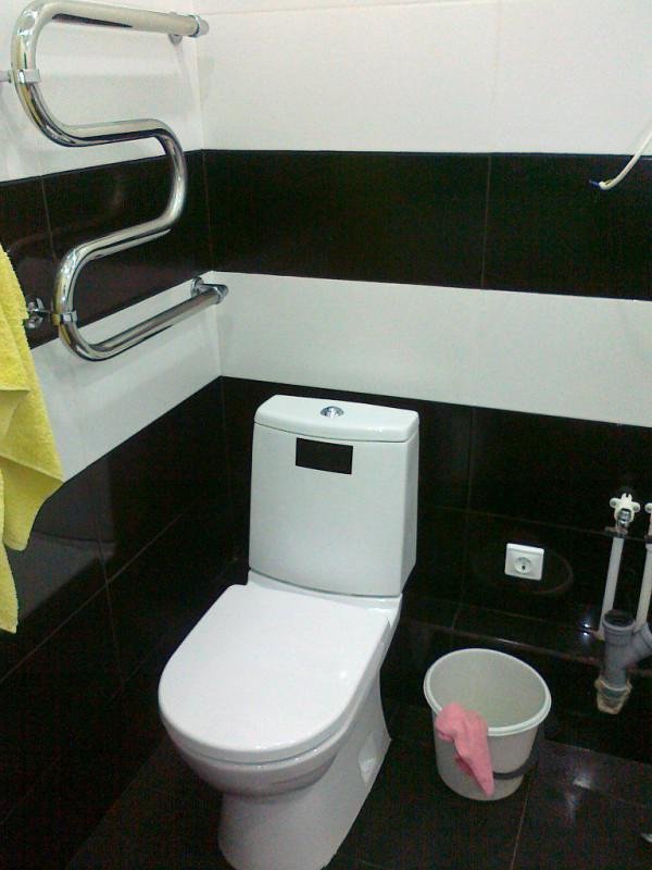 Les murs seront finis en deux couleurs: noir et blanc. En suivant la règle de base, qui vous permet d'agrandir visuellement l'espace, la couleur noire se fait sur la première moitié du mur. Pour effectuer une transition en douceur des couleurs sombres aux couleurs claires, une bordure en céramique est posée. Des deux bords de la bordure, une bande grise supplémentaire est installée, qui se cache avec succès, fournit une transition du blanc au noir. La bordure elle-même est achetée en blanc.