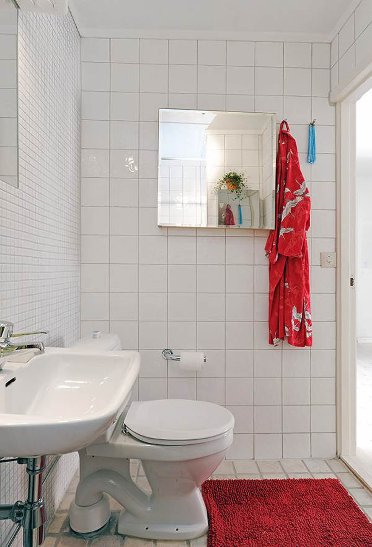 La partie supérieure du mur est finie avec des carreaux de céramique blancs. Au même endroit, vous pouvez vous démarquer de manière créative. Il n'est pas nécessaire de concevoir les murs avec des motifs stricts. Ajoutez des carreaux rectangulaires avec une image, une image, une image ou même une photo. Et pour donner un accent particulier, ces carreaux peuvent être rouges, jaunes, vert clair. Toute couleur brillante et accrocheuse fera l'affaire.