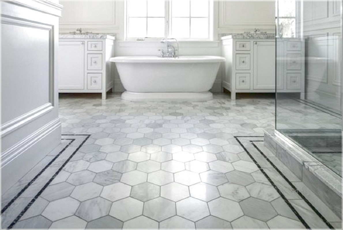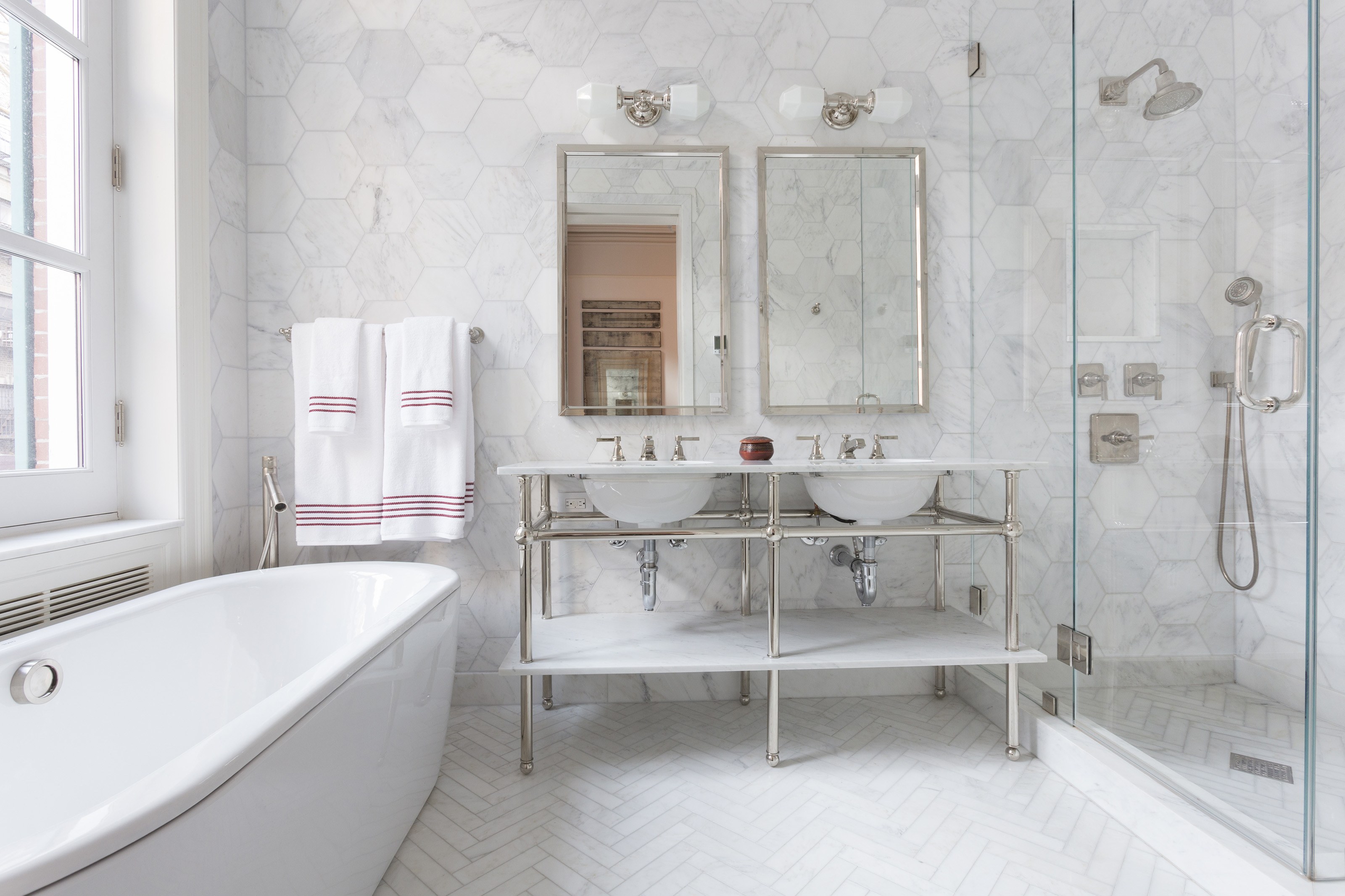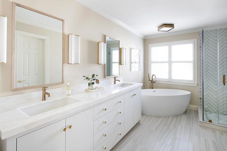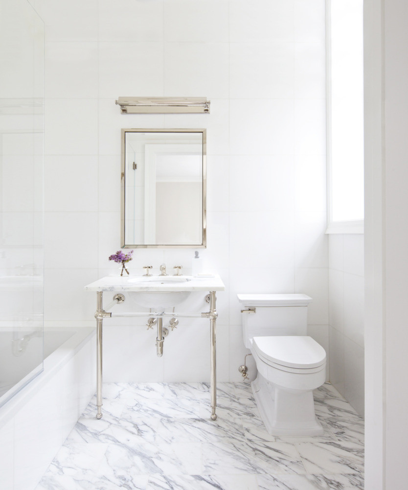 Les sols de salle de bains en marbre ajoutent de la brillance à la baignoire blanche mate.