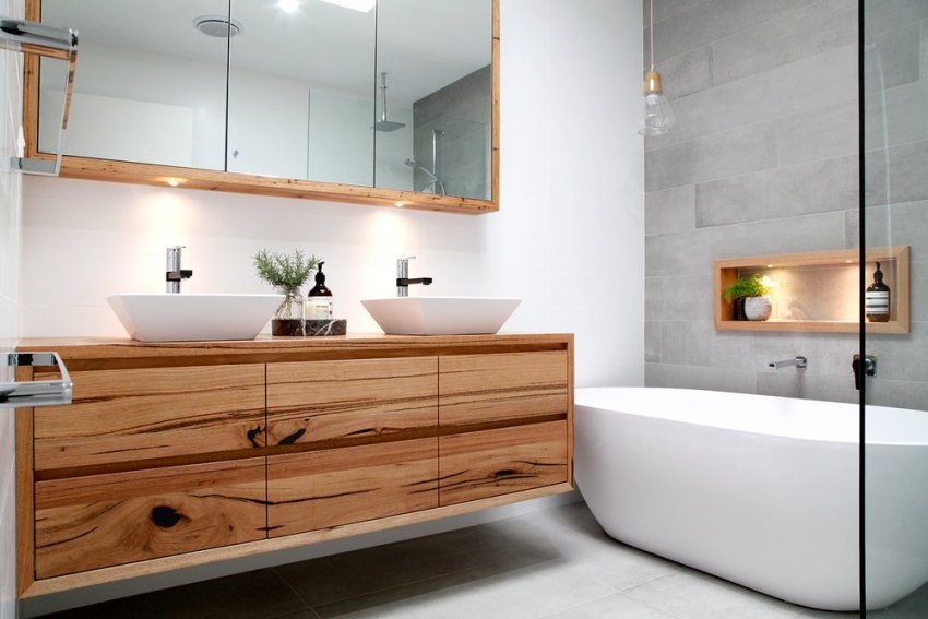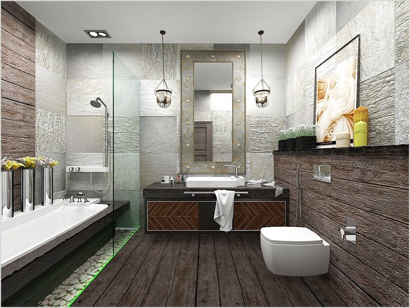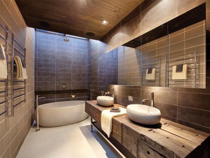 La salle de bain moderne peut être décorée dans un style rustique et meublée avec des meubles en bois massif.