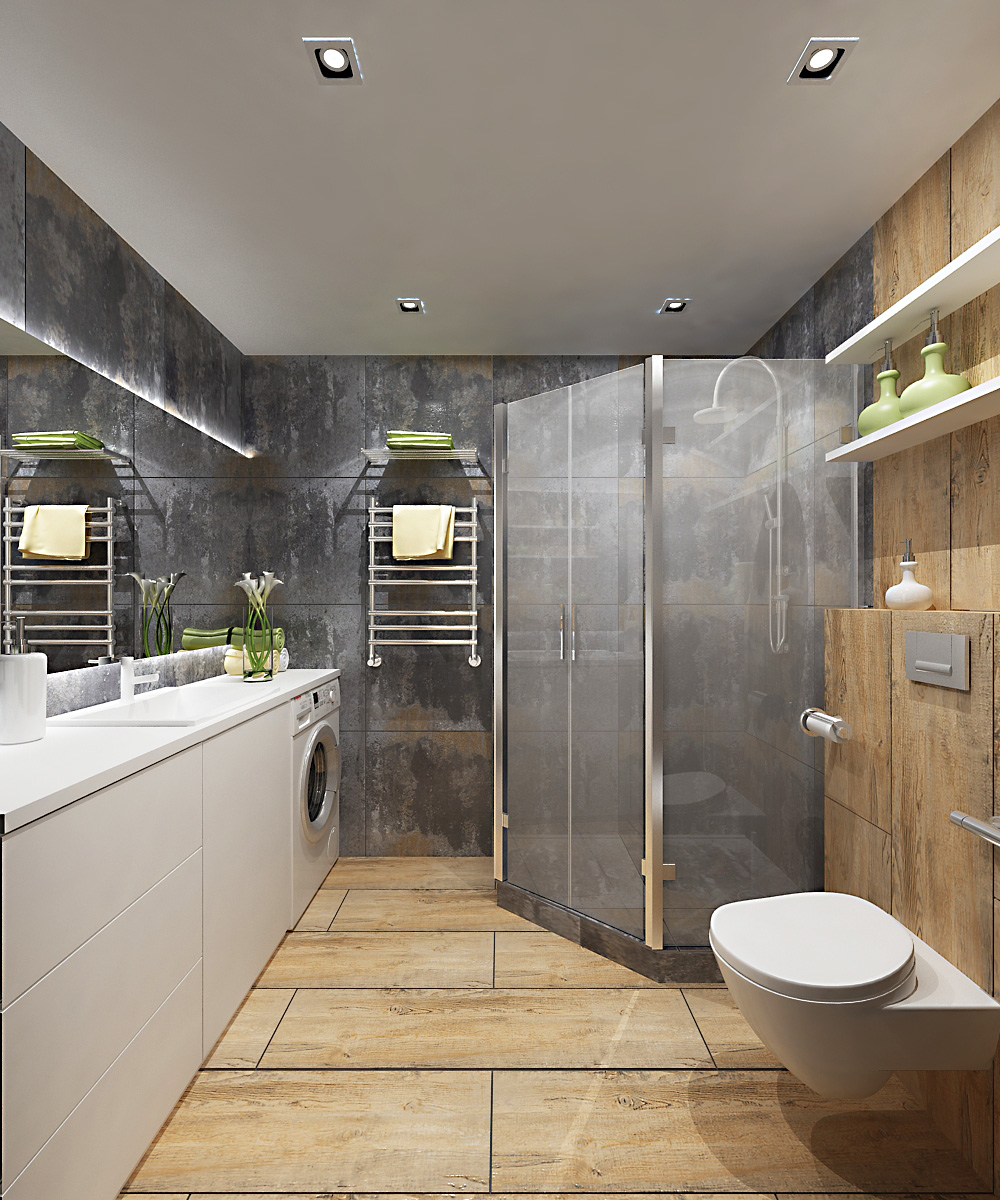 Bien sûr, il y a beaucoup moins de confort et de chaleur domestique ici que dans d'autres styles, mais cela est compensé par la fonctionnalité de haute technologie de la pièce utilitaire et son utilisation directement aux fins prévues, c'est-à-dire pour effectuer des procédures d'hygiène. Le design des couleurs est de préférence monophonique, proche du minimalisme, principalement des nuances de gris et de beige, mais parfois le design monochrome général peut être dilué avec des détails lumineux, par exemple, une étagère toxique rouge ou verte, une armoire.