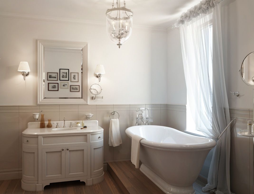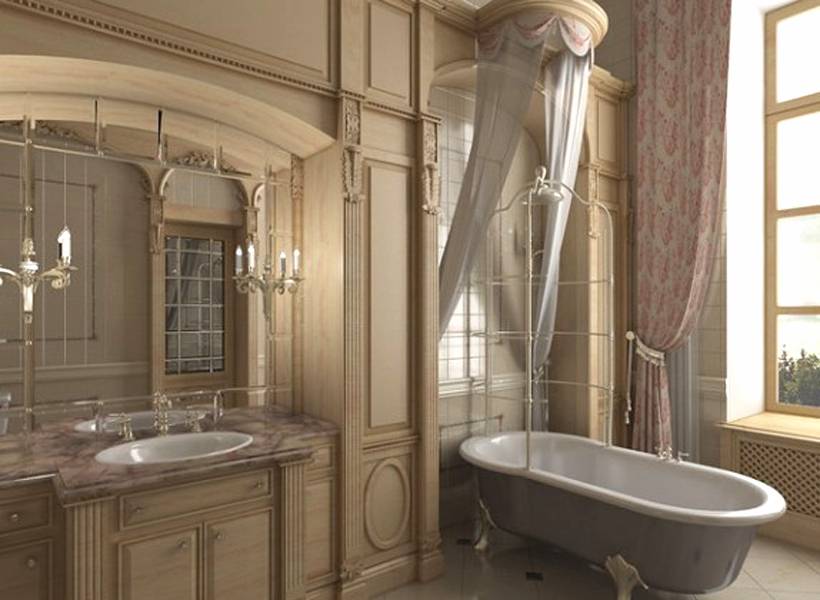 Dans une salle de bain de style classique, les miroirs peuvent être décorés avec des baguettes