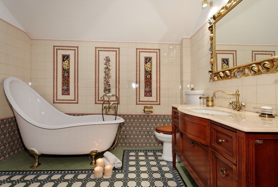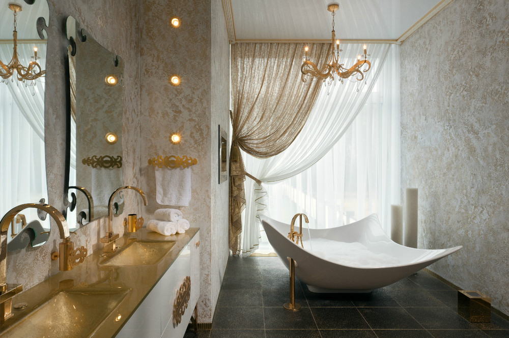 Les sols d'une telle salle de bain doivent également être conçus pour correspondre autant que possible au style général (soit les motifs sont des lignes courbes ou une image florale). En ce qui concerne le matériau, le sol peut être fait à la fois de carreaux de sol et de mosaïques, il y a toujours la possibilité de le rendre en vrac.
