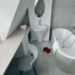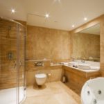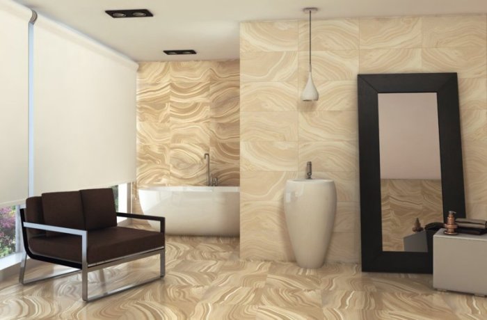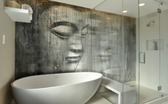Les matériaux pour la salle de bain sont la céramique et les carreaux émaillés, le marbre et le verre. L'avantage du plan réfléchissant est de créer une expansion visuelle des murs, en élevant visuellement le plafond. Selon le Feng Shui, la création d'une surface lisse et scintillante arrêtera l'influence des flux porteurs d'énergie négative.