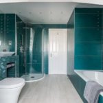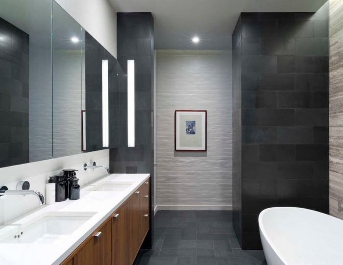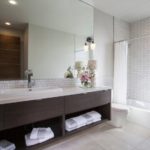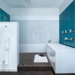 Une grande surface vous permet de réaliser plus d'idées, d'appliquer plus de contrastes. Mais ici, il est également important de ne pas se tromper de couleur. Des combinaisons infructueuses entraîneront une perte visuelle du volume. Il est nécessaire de rendre le ton clair dominant. Les nuances foncées lumineuses devraient créer une combinaison harmonieuse de couleurs à l'intérieur de la salle de bain, associée à la couleur principale.